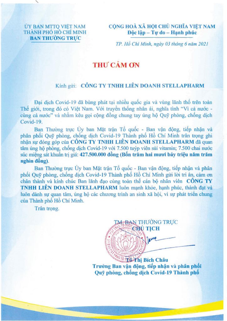 Sự đóng góp tuy nhỏ nhưng thông qua đó, Stellapharm mong muốn thể hiện lòng tri ân đối với sự hy sinh của các lực lượng tuyến đầu đang “chiến đấu” miệt mài chỉ để mang lại bình yên và an toàn cho Thành phố. Với tôn chỉ “Trân trọng từng giá trị cuộc sống”, các mục tiêu sức khỏe cộng đồng luôn được đặt lên trên hết trong mọi hoạt động của Stellapharm. Chung tay cùng cộng đồng, Stellapharm muốn lan tỏa sự yêu thương và trách nhiệm của mình một cách cụ thể hơn, để dù chúng ta đang ở giữa tâm dịch, phải đối mặt với nhiều khó khăn và đang phải thực hiện giãn cách xã hội, nhưng khoảng cách từ trái tim đến trái tim lại gần hơn bao giờ hết.